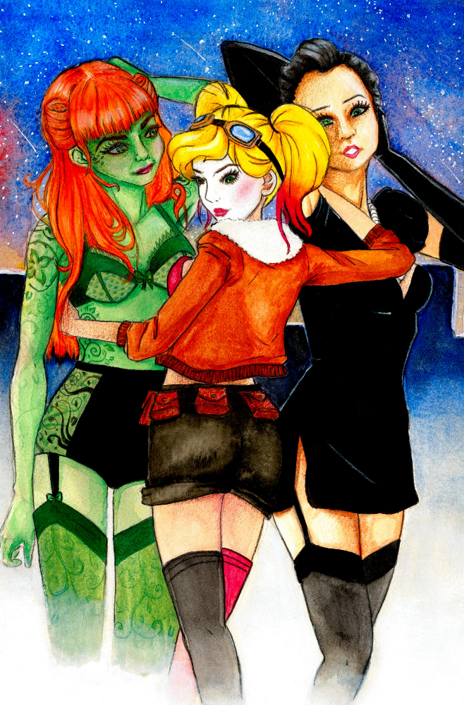 Out of it came this piece. A year previous I had come out as pansexual and polyamorous, and so had Harley Quinn (well… bisexual/polyamorous) through the Bombshells comic, and my customer’s request was for Poison Ivy, Catwoman, and Harley, so it just seemed obvious what I had to do.