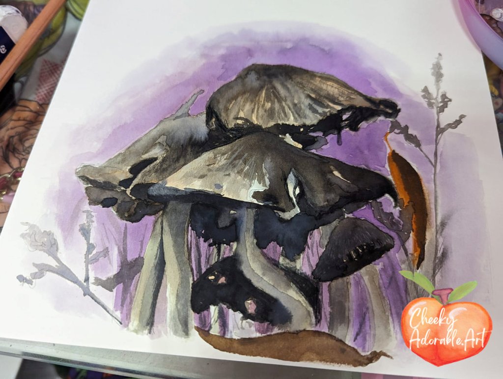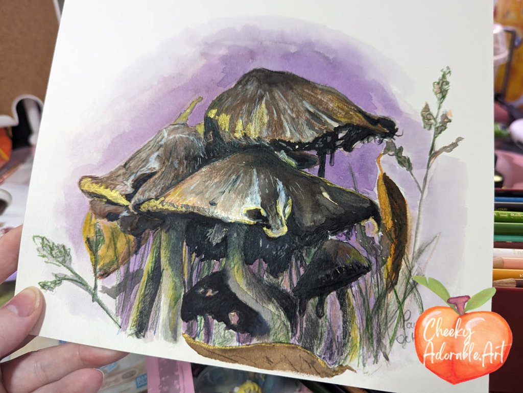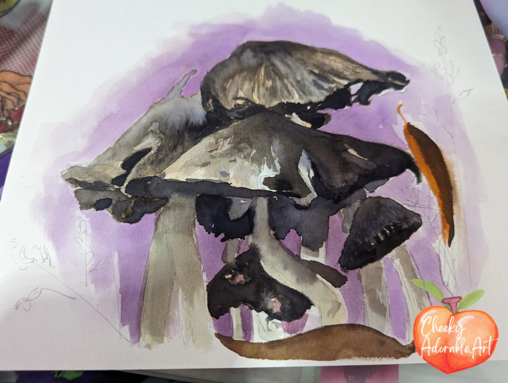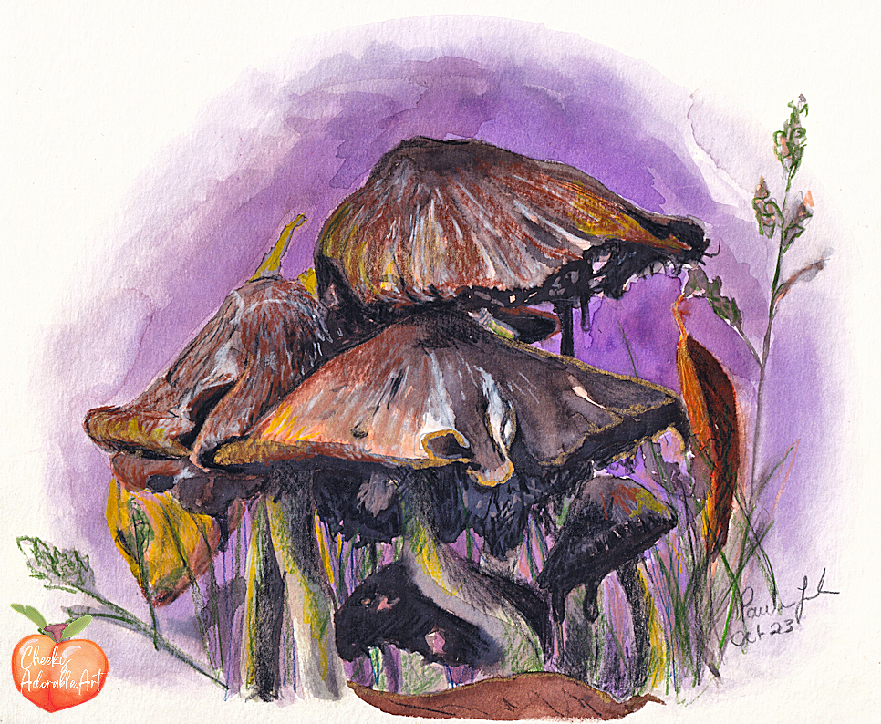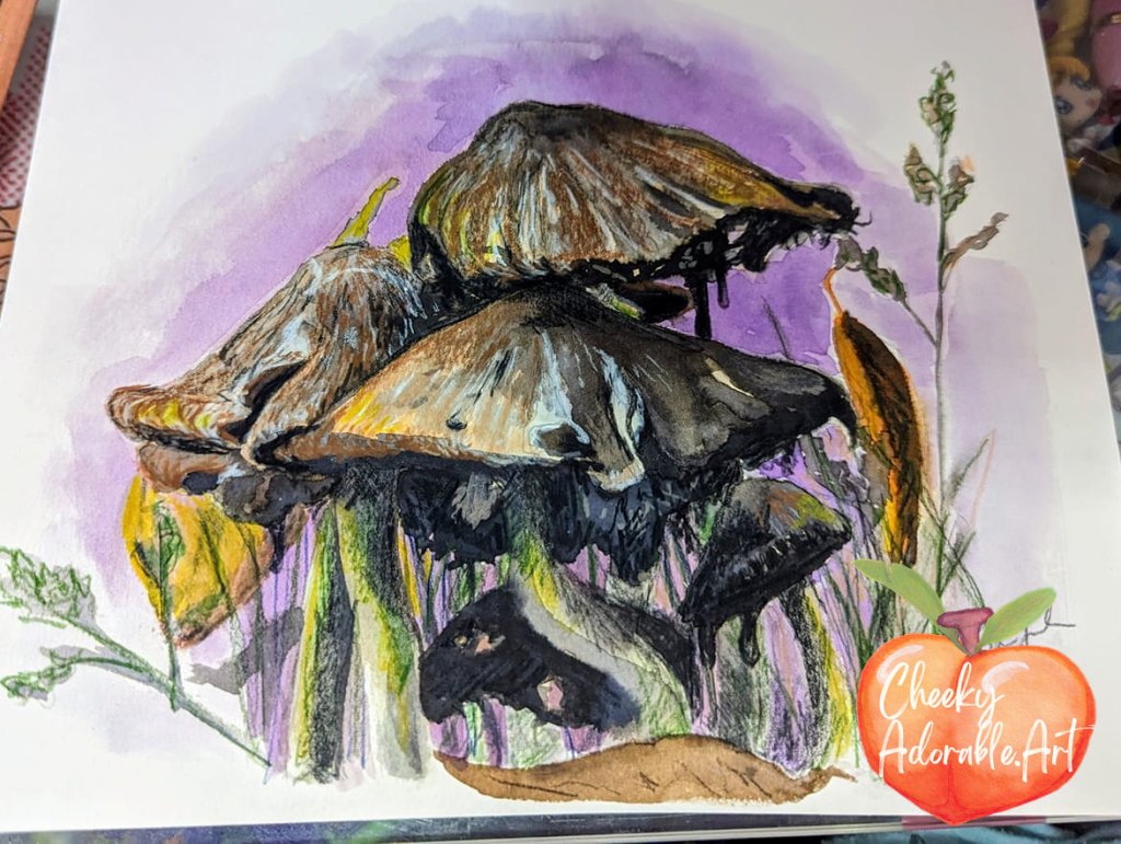 This piece was a lot of fun and very challenging for me. Most of my art is bright, colourful, and cheerful, but as my prompt was “spooky” and my subject was a group of inky cap mushrooms I aimed to go a little darker and use more black than usual. Admittedly, this final piece was round 2. I initially started out too dark and decided to just start over. The final piece consists of several layers of brown and grey watercolour washes with pencil crayons on top to introduce a better texture, more defined shapes, and deeper tones.