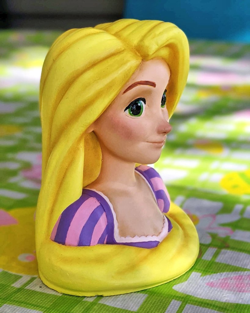 She came out of the box rather rough. She had lines top to bottom from the 3D printed mould she was cast in, and there was both the issue of too much or not enough plaster in some places, including large chunks that had broken off from her hair. All of this was sanded down and repaired best I could do. It couldn’t be puttied because the putty fell off, so I sanded down the gaps in ways that looked as natural as I could make them look, but thankfully the sculpting of the face was actually spectacular.
